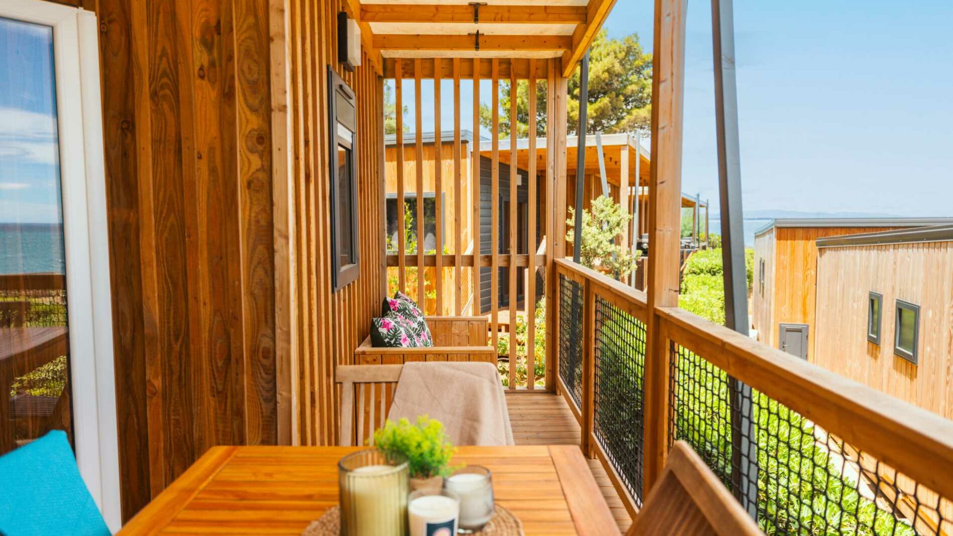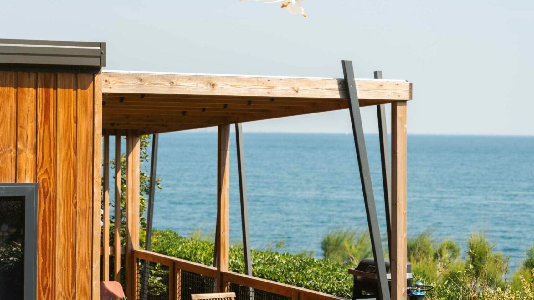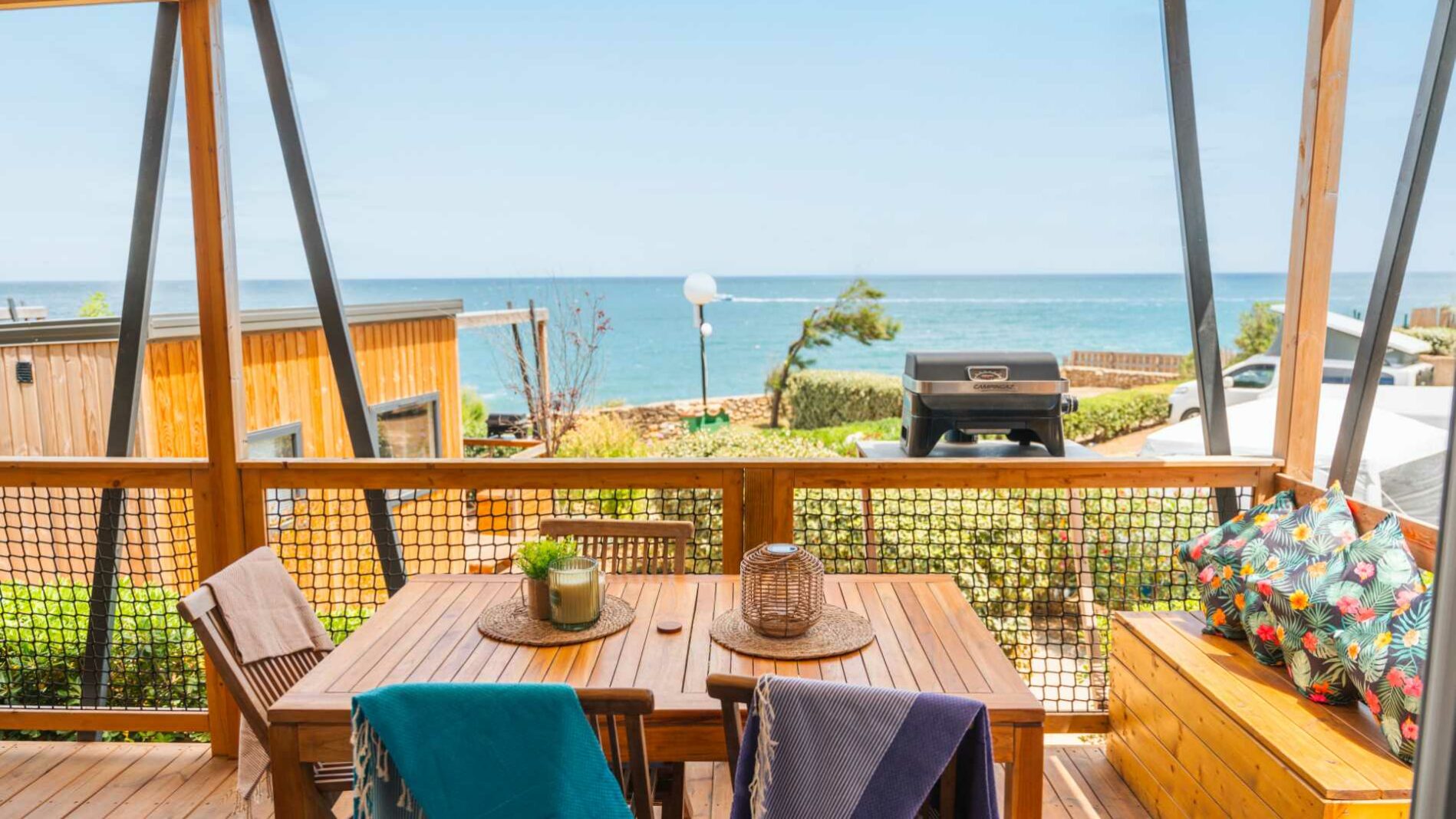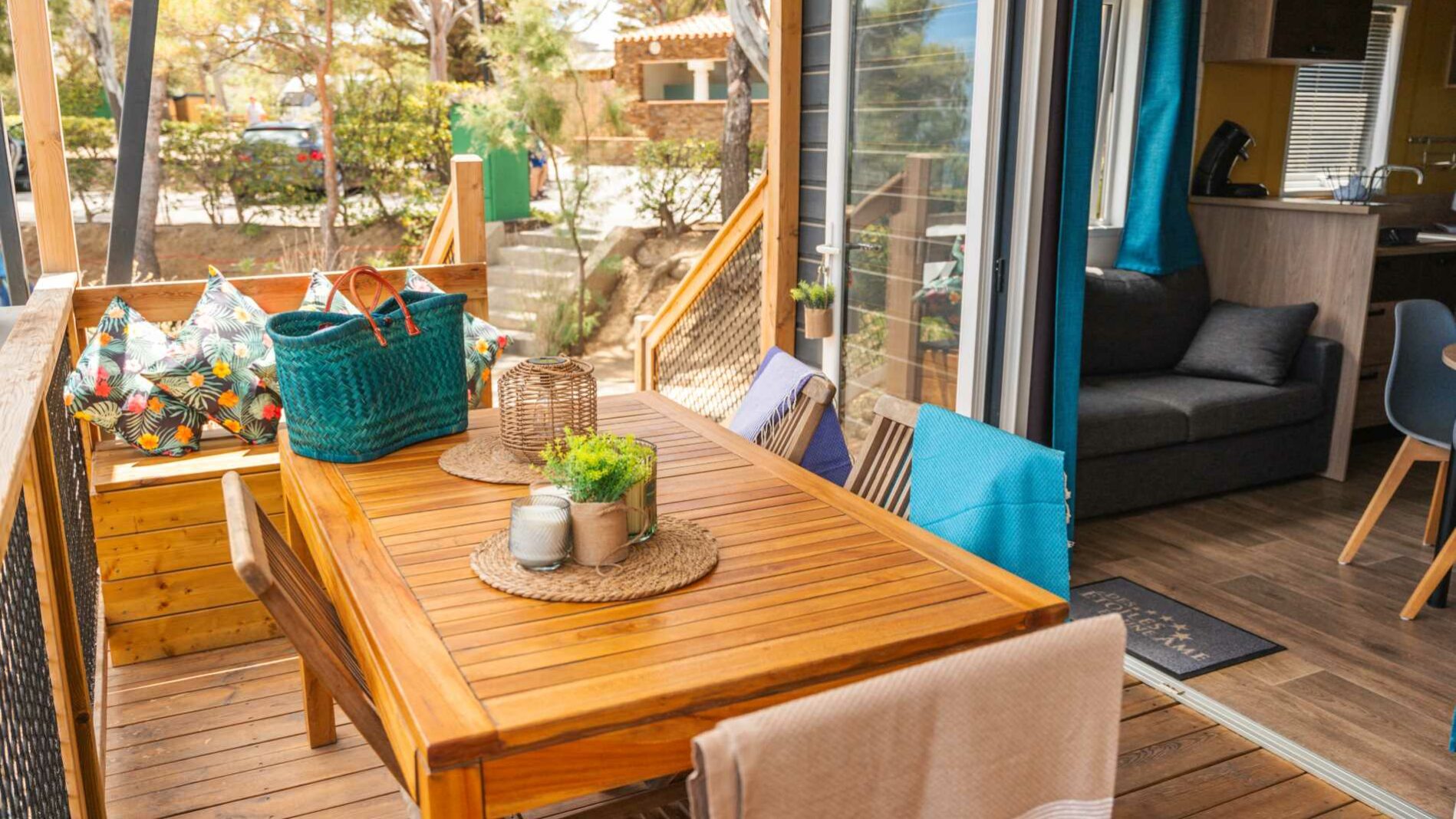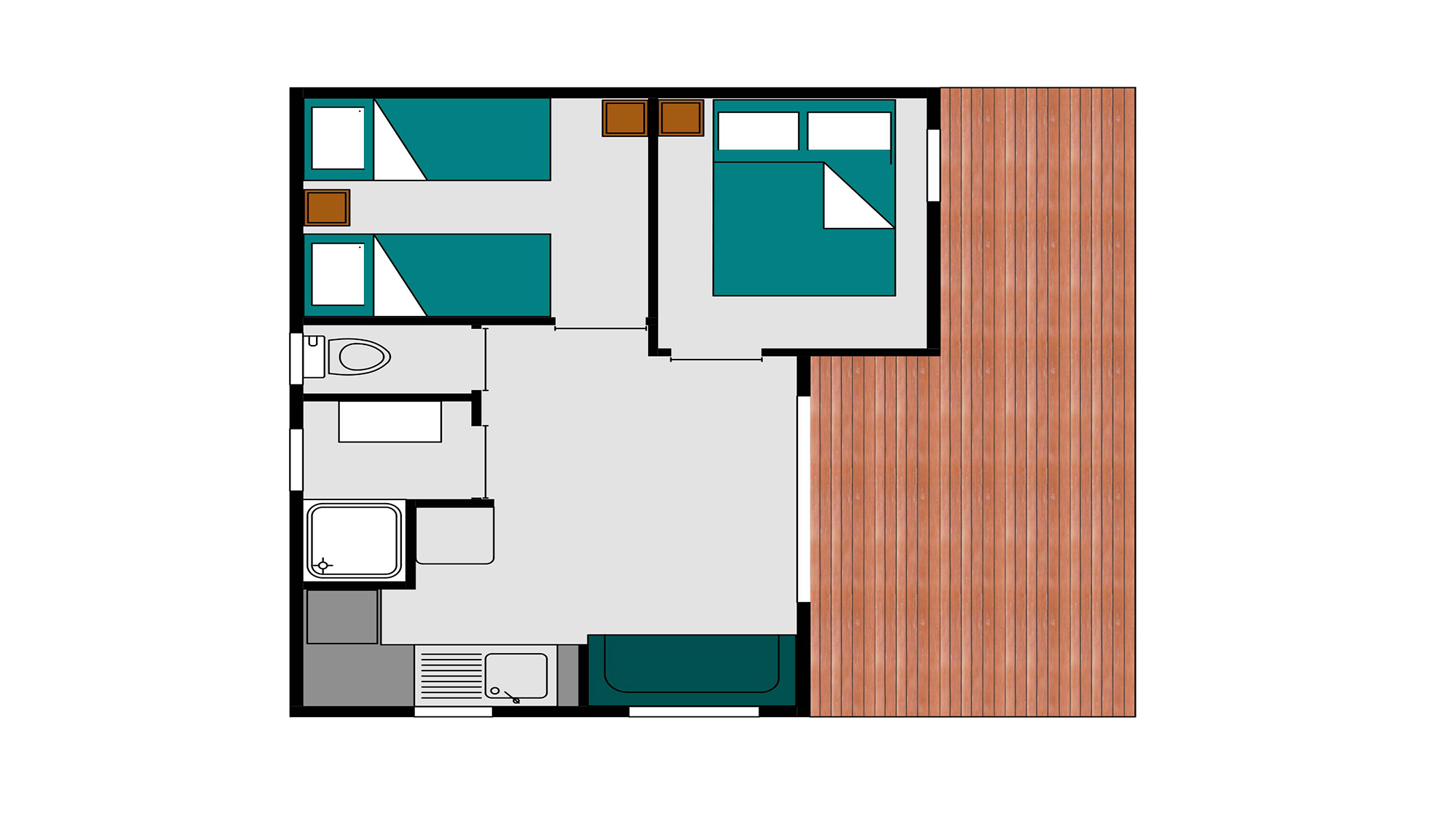 27 m2 + Terrasse couverte. Une chambre avec 1 lit double (140 x 190), une chambre avec 3 lits (80 x 190) dont 1 superposé, un coin salon, une cuisine équipée. Une salle d’eau avec lavabo douche et WC séparé. Salon de jardin en bois. Climatisation installée dans la chambre parentale.