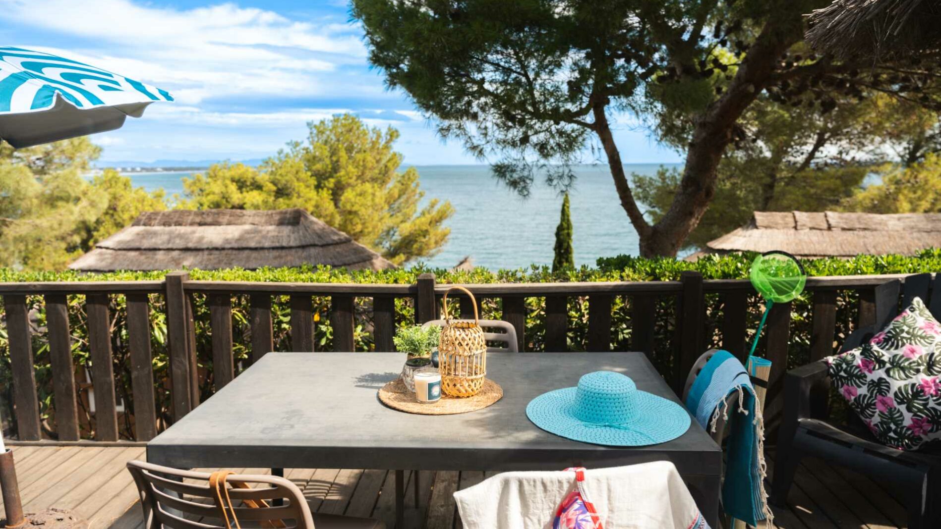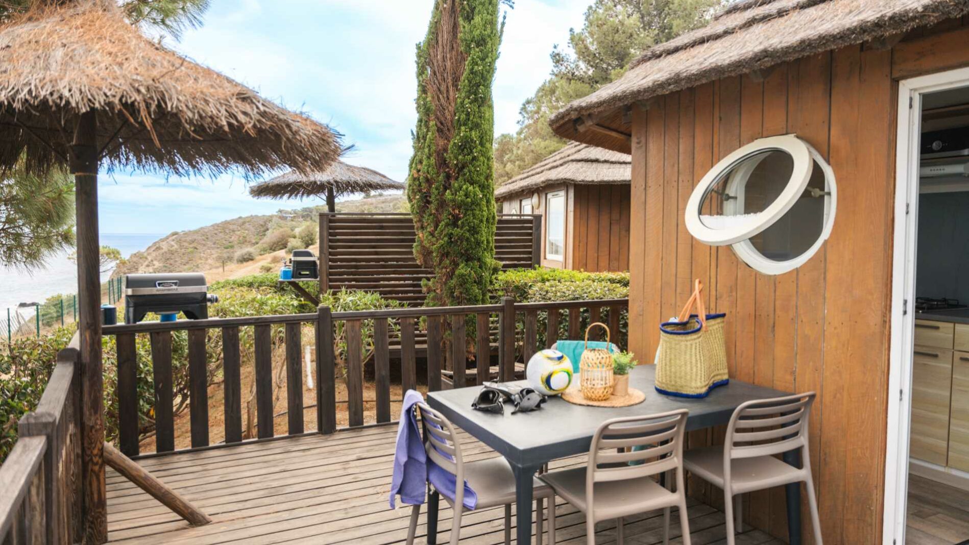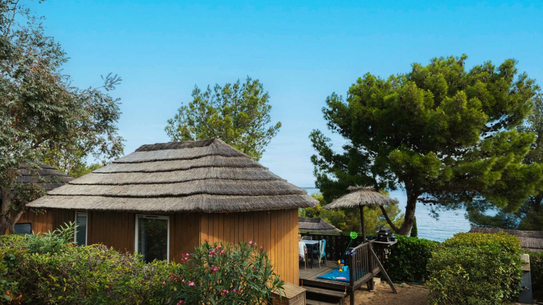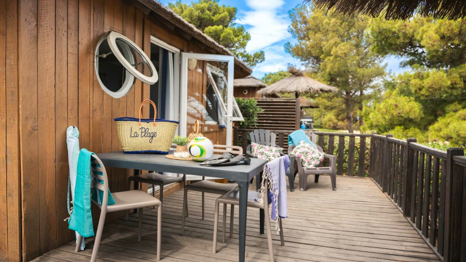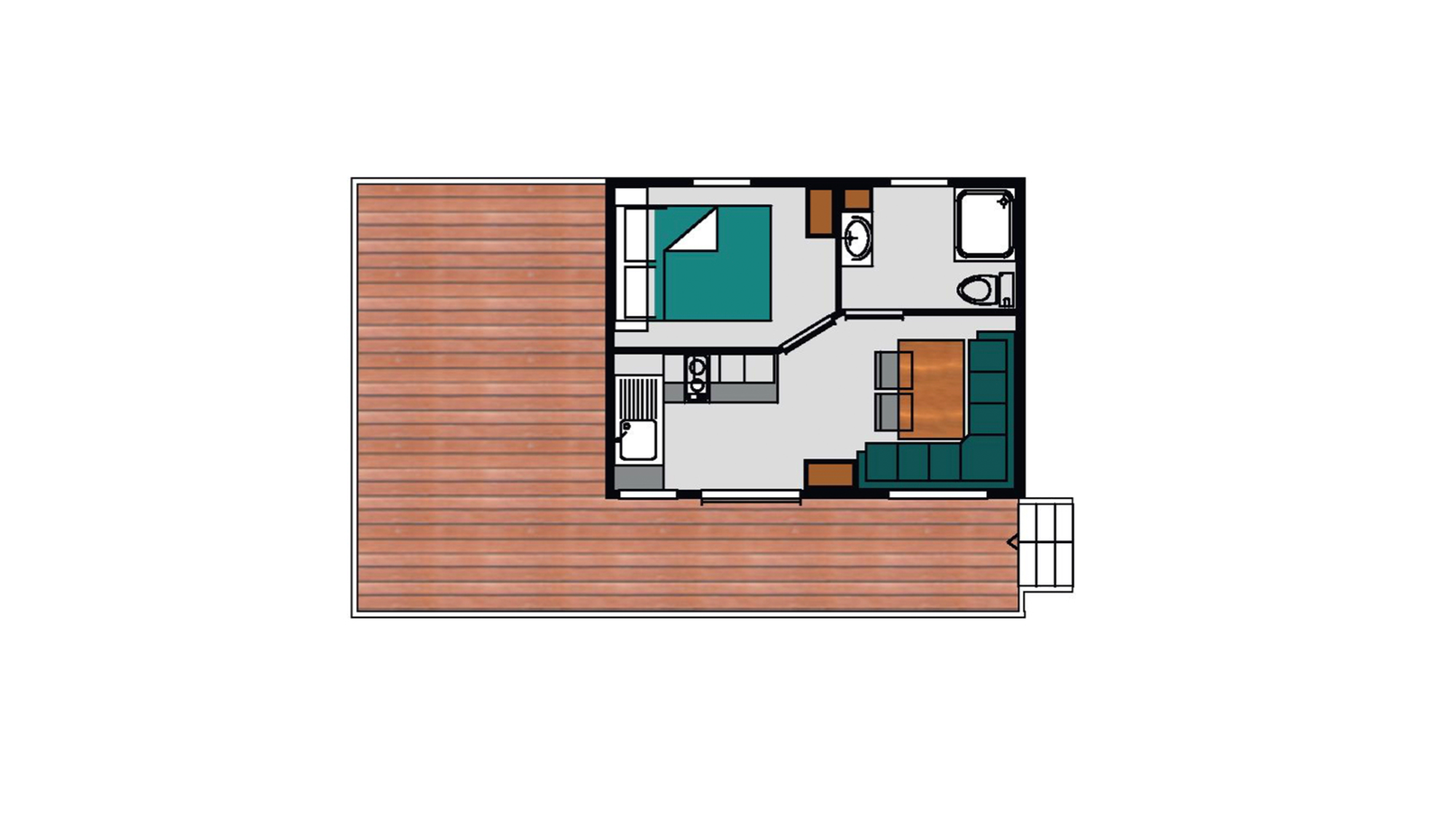 Le confort d’un mobile-home relooké en cabane de 20 m². Une chambre double avec 1 lit (160 x 200). Un coin repas convertible en lit 2 personnes (140 x 190). Une cuisine équipée. Une salle d’eau avec lavabo, douche et WC. Une terrasse en bois variant de 15 à 22 m² selon l’espace extérieur disponible car tous nos Faré sont différents. Un salon de jardin avec un parasol fixe en bruyère.