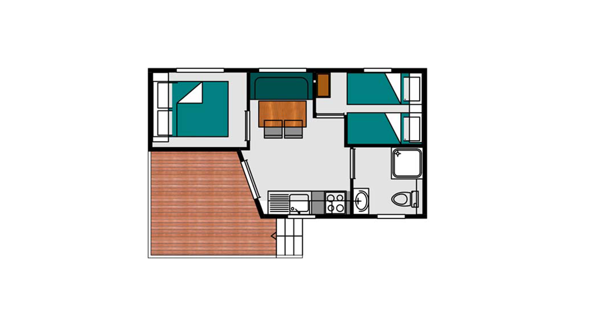 20 m² + 7 m² De terrasse couverte, une chambre avec lit double (160 x 200), une chambre avec 2 lits simples (80 x 190). Un coin repas convertible en lit 2 personnes (140 x 190). Une cuisine équipée. Une salle d’eau avec lavabo, douche et WC. Salon de jardin.